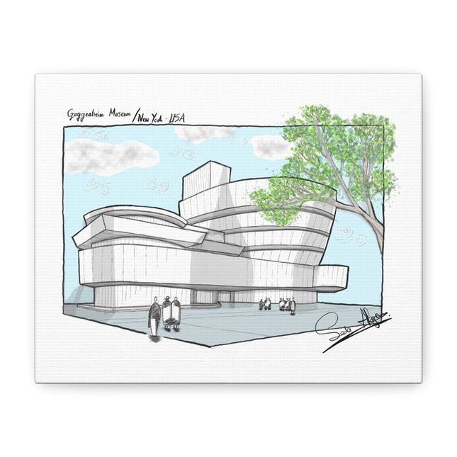 Guggenheim Museum Matte Canvas PrintShowcase the iconic Guggenheim Museum in New York City with this stunning matte canvas print, featuring a hand-drawn depiction of Frank Lloyd Wright’s architectural masterpiece. This artwork captures the unique, modernist design of the museum, complemented by serene surroundings that inspire creativity and innovation.Printed on premium materials with an eco-friendly pine frame, this canvas is crafted to add sophistication to any living space, office, or creative corner. Perfect for art and architecture enthusiasts, this piece combines elegance with sustainability.Key Features:High-Quality Materials: Canvas made from a cotton and polyester composite for a vibrant, matte finish.Sustainable Frame: Inner frame constructed from ethically sourced radiata pine from renewable forests.Versatile Sizes: Available in 60 different sizes, with horizontal, vertical, and square options to suit your space.Supportive Design: Soft rubber dots on the back corners add stability and protect your walls.Effortless Installation: Comes with back hanging included for convenient placement.Precision Construction: Slight size deviations may occur due to the production process (+/- 1/8" tolerance).Bring the timeless beauty of the Guggenheim Museum into your space with this meticulously crafted canvas print. Whether for personal enjoyment or as a thoughtful gift, this artwork celebrates one of the world’s most iconic architectural marvels.
