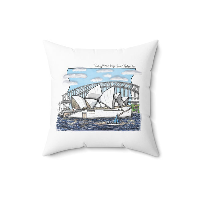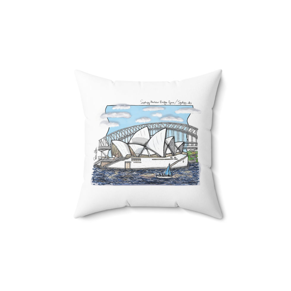 Sydney Iconic Architecture Throw PillowTransform your space with the timeless beauty of Sydney's most iconic landmarks—the Sydney Harbour Bridge and Opera House. This hand-drawn artwork captures the harmonious blend of architectural brilliance and natural serenity, making it a perfect addition to any home. The back of the pillow features the inspirational phrase, "Harmony unfolds where the sea meets the stage of dreams," embodying the spirit of creativity and innovation.This throw pillow is part of a customizable collection, allowing you to personalize the back with your own meaningful phrase, making it truly unique.Key Features:Premium Materials: Durable 100% polyester cover with a soft and supportive polyester insert included.Double-Sided Design: Front features stunning Sydney architecture; back includes a customizable phrase.Concealed Zipper: Seamless design for a polished look and easy care.Customizable Back Side: Replace the phrase with one of your choice for a personal touch.Size Options: Available in various sizes to suit any room or decor style.This elegant pillow is ideal for travel lovers, architecture enthusiasts, or anyone who admires Sydney’s cultural and artistic legacy. Perfect as a thoughtful gift or a statement piece for your living space.Celebrate the beauty of Sydney with this unique and customizable throw pillow.