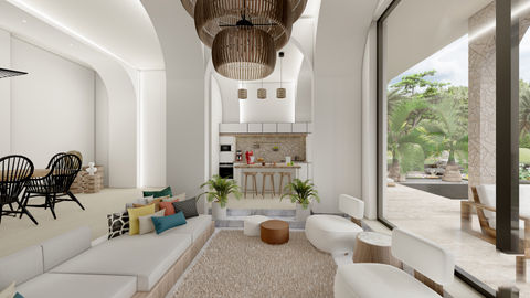 Inspired by Ibiza’s iconic whitewashed homes and airy layouts, this villa captures that relaxed Mediterranean spirit. A fusion of traditional Spanish elements and modern architecture, the design features exposed wooden beams, stone flooring, and soft neutral tones—offering a refined yet inviting retreat.